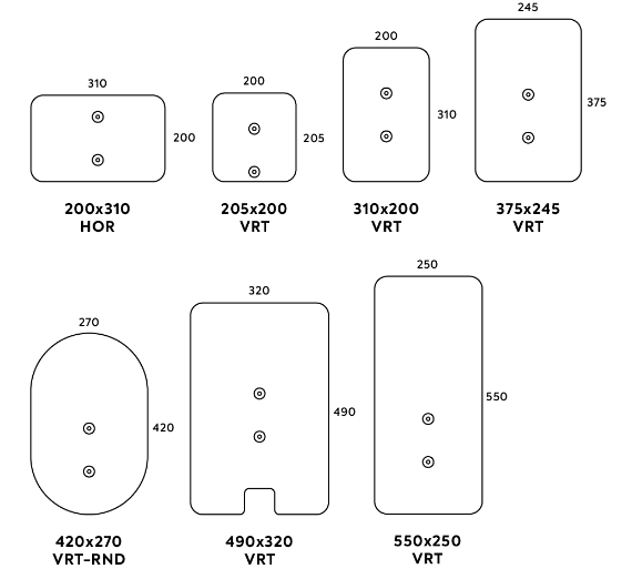 Nachfolgend finden Sie die Abmessungen der verfügbaren Charger Plates. Die Abmessungen werden in Höhe x Breite in mm angegeben und die Ausrichtung wird durch "HOR" für horizontale Ausrichtung (Höhe ist kleiner als Breitengröße) und "VRT" für vertikale Ausrichtung (Höhe ist größer als Breitengröße) angegeben. Wenn die Chargerplate abgerundete Kanten hat, wird dies mit "RND" angezeigt.