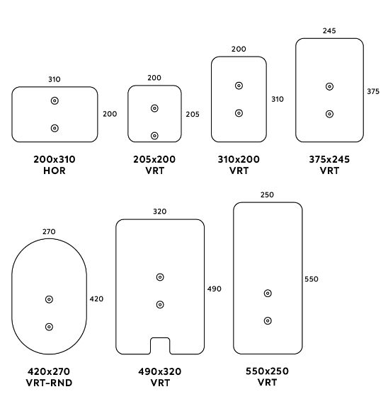 Below you will find the dimensions of the available Charger plates. The dimensions are shown in Height x Width in mm and the orientation is indicated by "HOR" for horizontal orientation (height size is smaller than width size) and "VRT" for vertical orientation (height size is larger than width size). When the Chargerplate has rounded edges, this is indicated with "RND".
